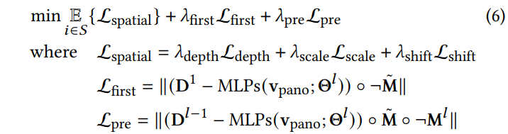 최적화 이후 depth map D^1은 geometric field에 대해 v_pano를 입력하여 결정되고, 결국 D^l=MLP(v_pano;geofield)인 것이다..?